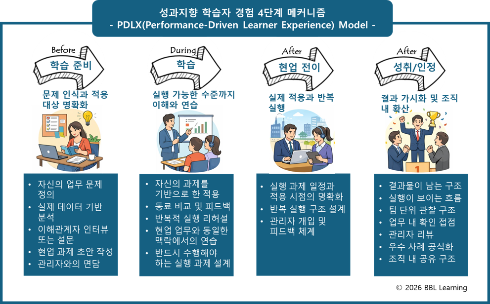 BBL PDLX(Performance-Driven Learner Experience) 설계 모델은 위의 확장된 관점을 구조화한 것이다. 이는 학습자의 경험을 교육 과정 내부에 한정하지 않고, 학습 준비–학습–현업 전이–성과/인정까지 확장하여 실제 행동 변화와 성과 창출이 일어나도록 설계하는 접근이다. ‘완전한 학습자 경험’을 보다 명확하게 이해하기 위해서는, 이를 하나의 연속된 메커니즘으로 구조화해볼 필요가 있다. Part 2에서 다룬 [BBL 성과지향 학습·개발 구현 프로세스(BBL Performance Driven Learning & Development Process)]의 두번째 단계인 [학습설계]를 실제 설계 가능한 구조로 정리하면 다음 네 단계로 정의할 수 있다: